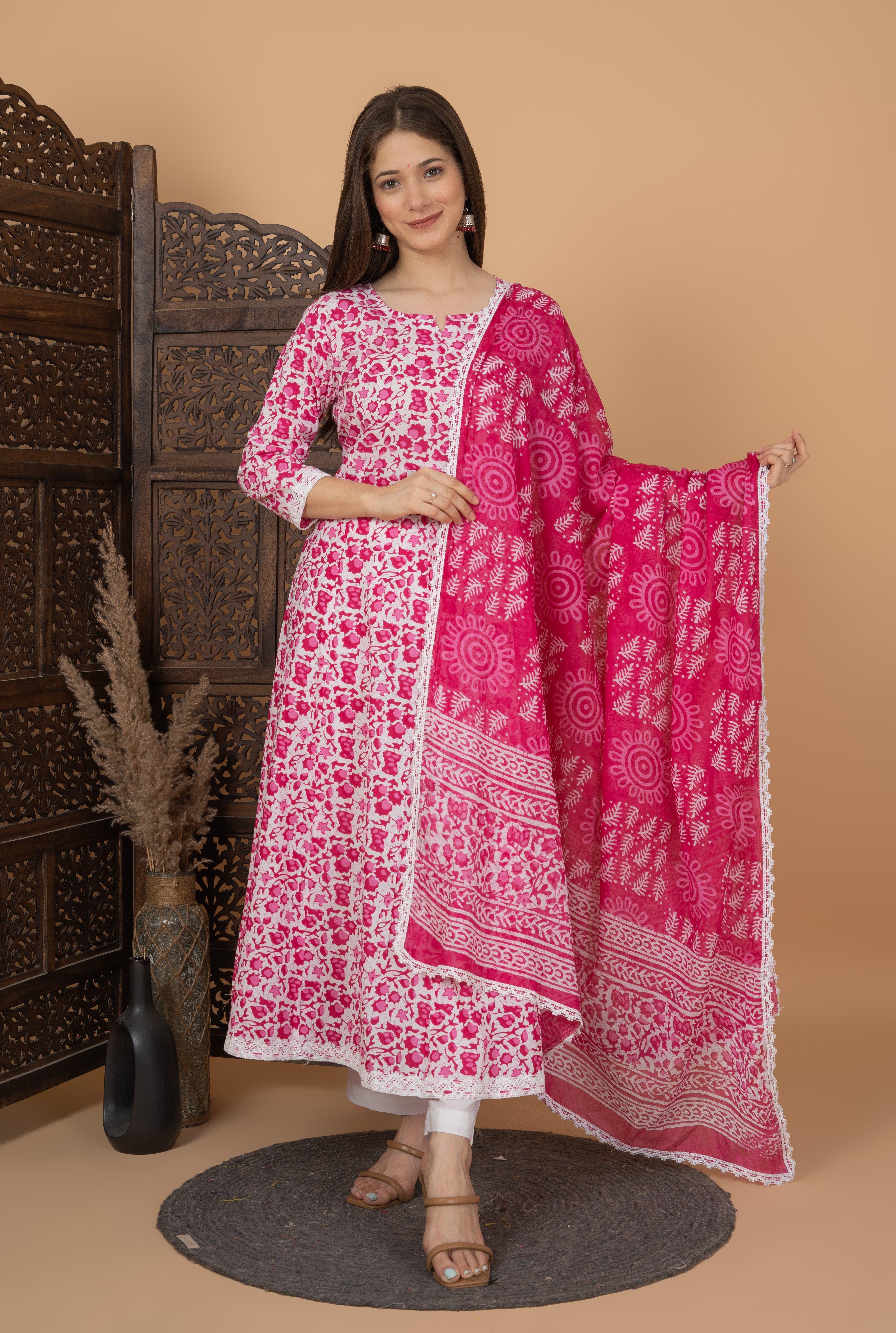 MEERA FAB Women's Cotton Printed Anarkali Kurta with Palazzo & Dupatta Set
